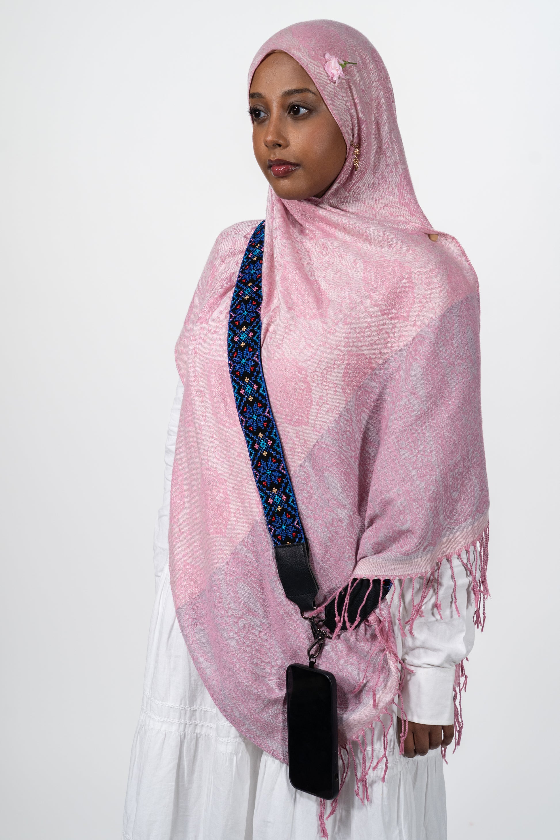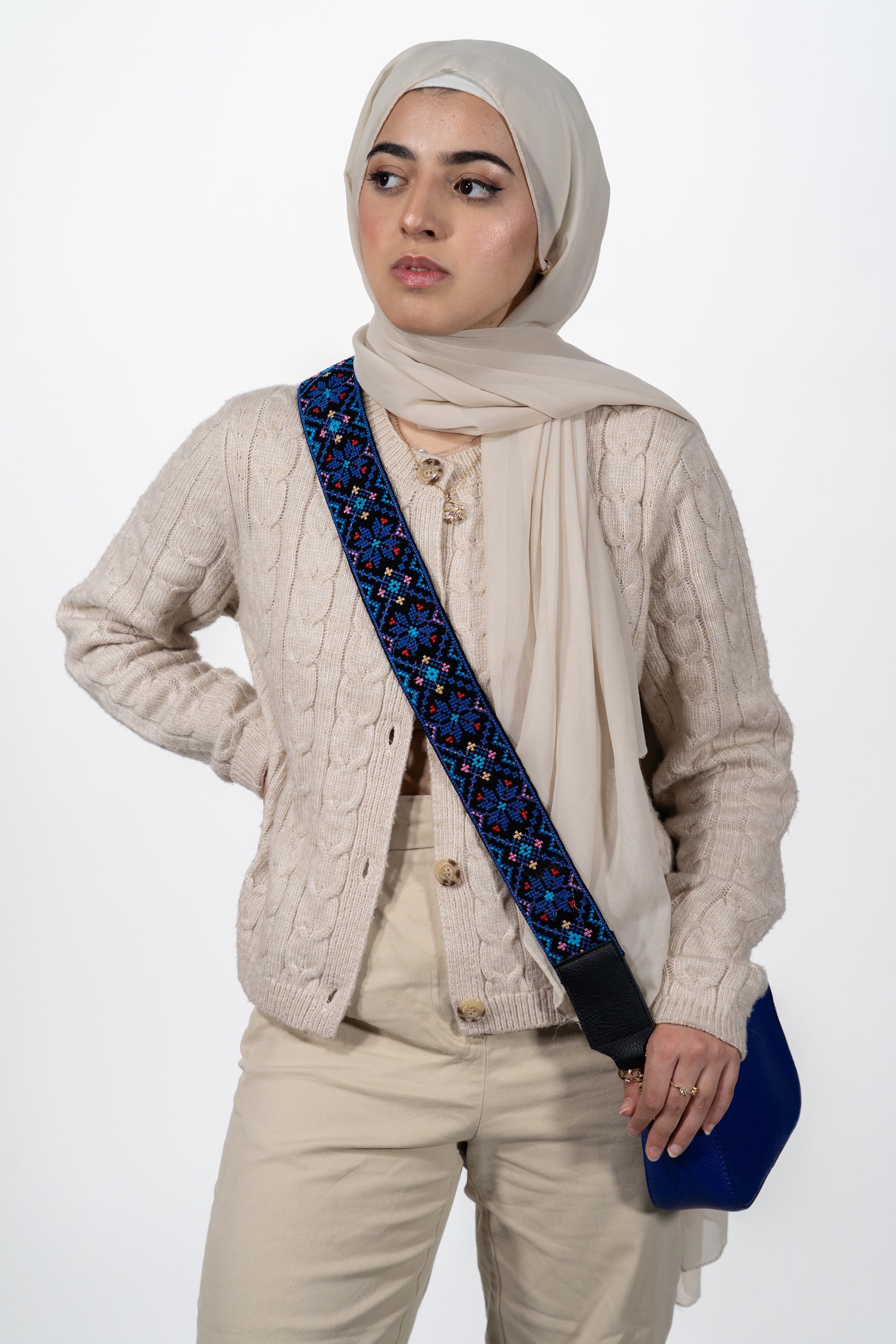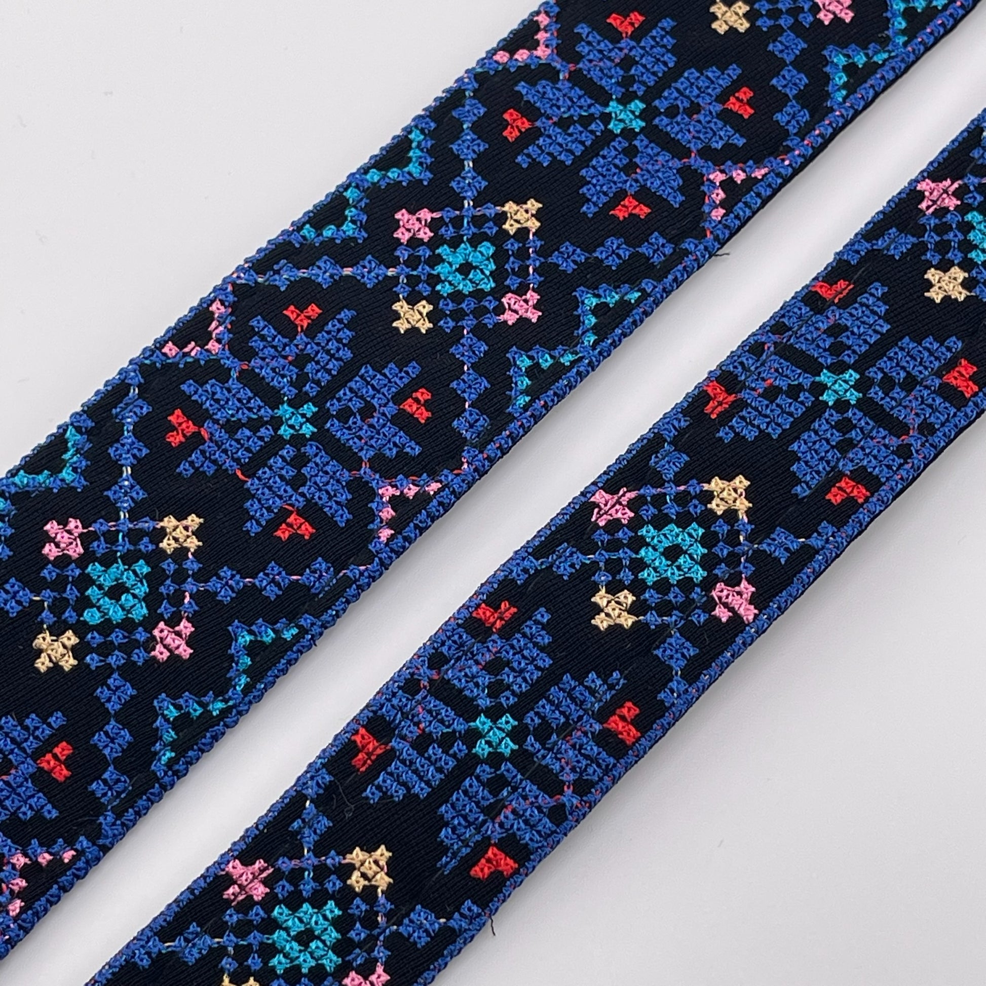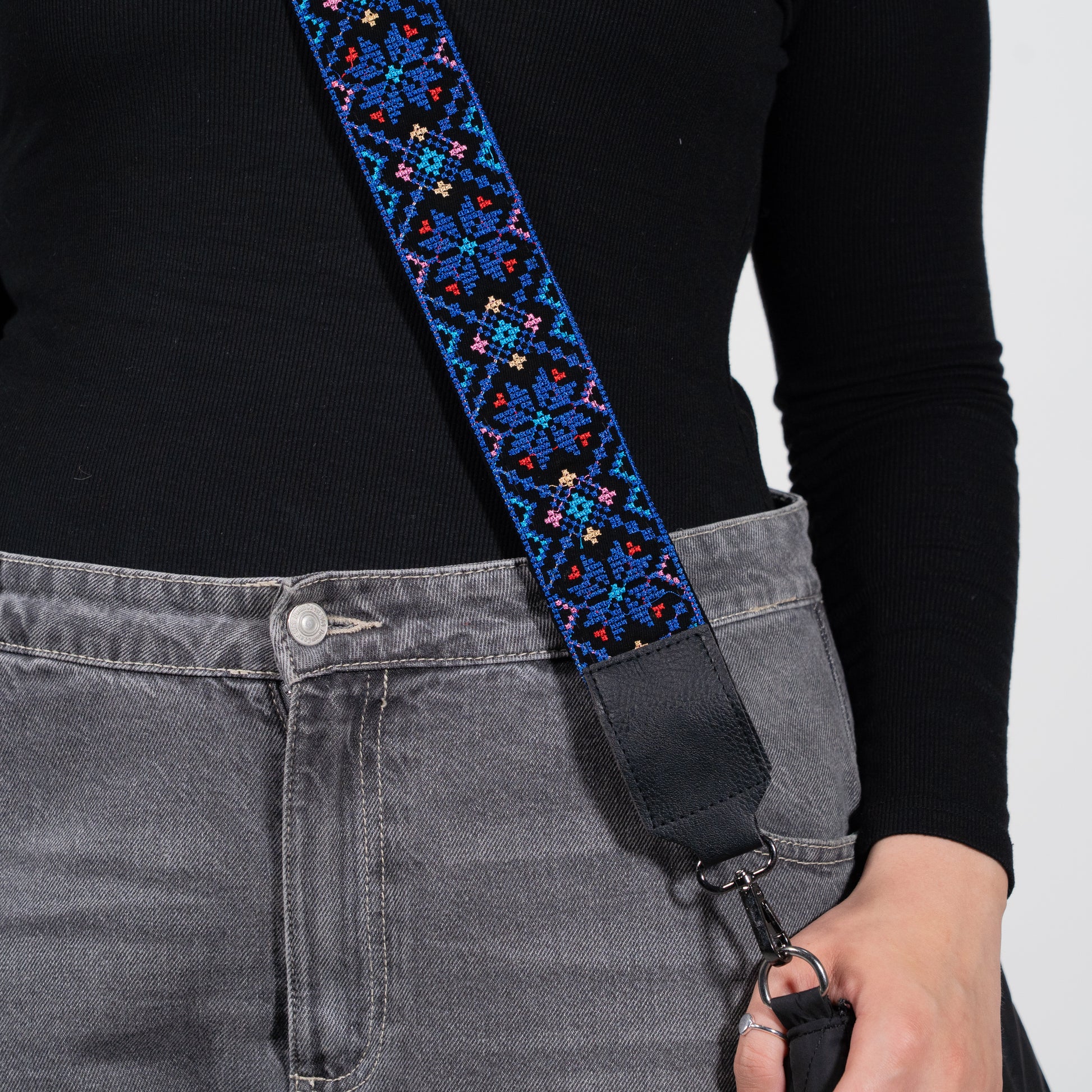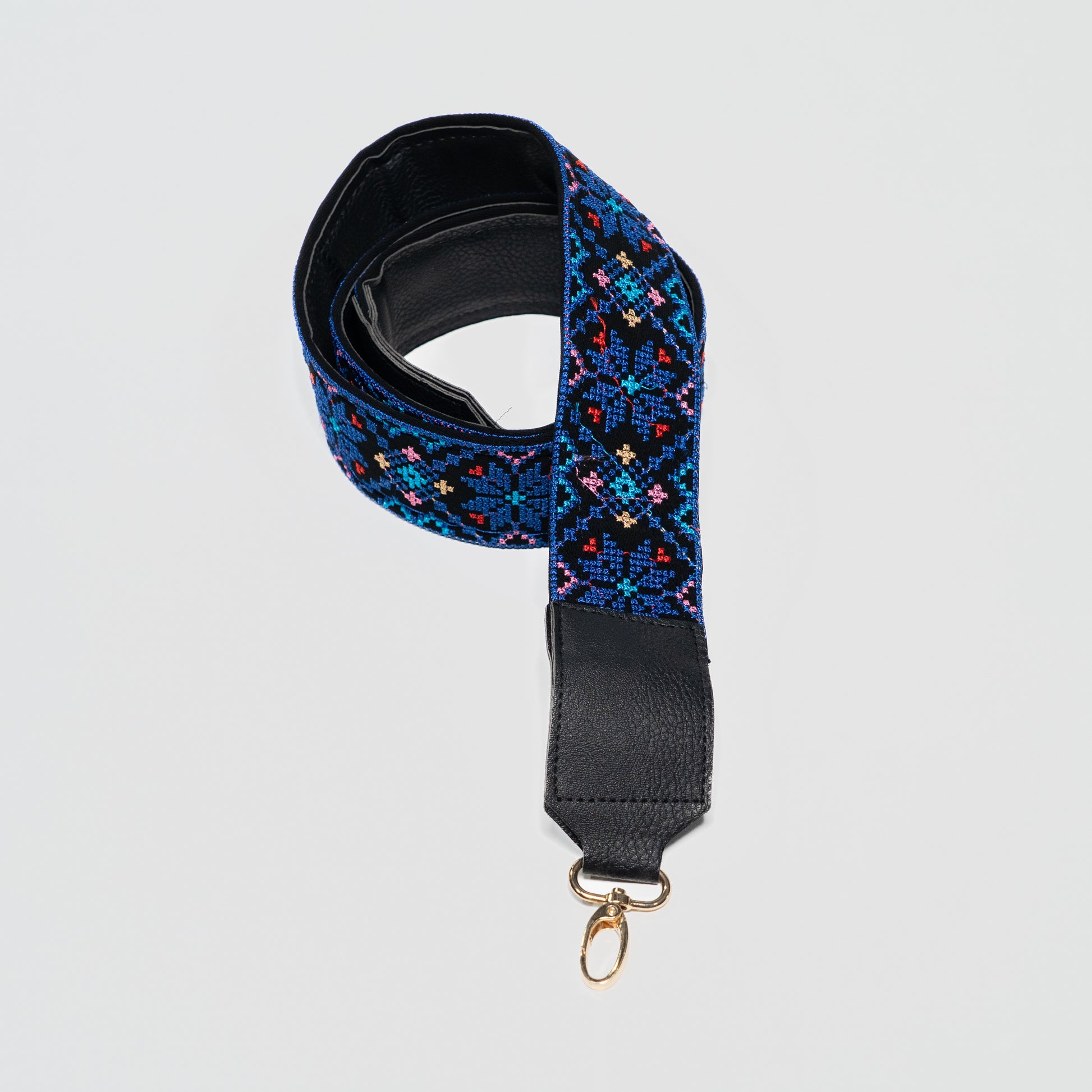 Soft faux leather strap, available in a variety of hardware colours, embroidered with a traditional multicoloured pattern with a dark blue base, native to the indigenous in Palestine