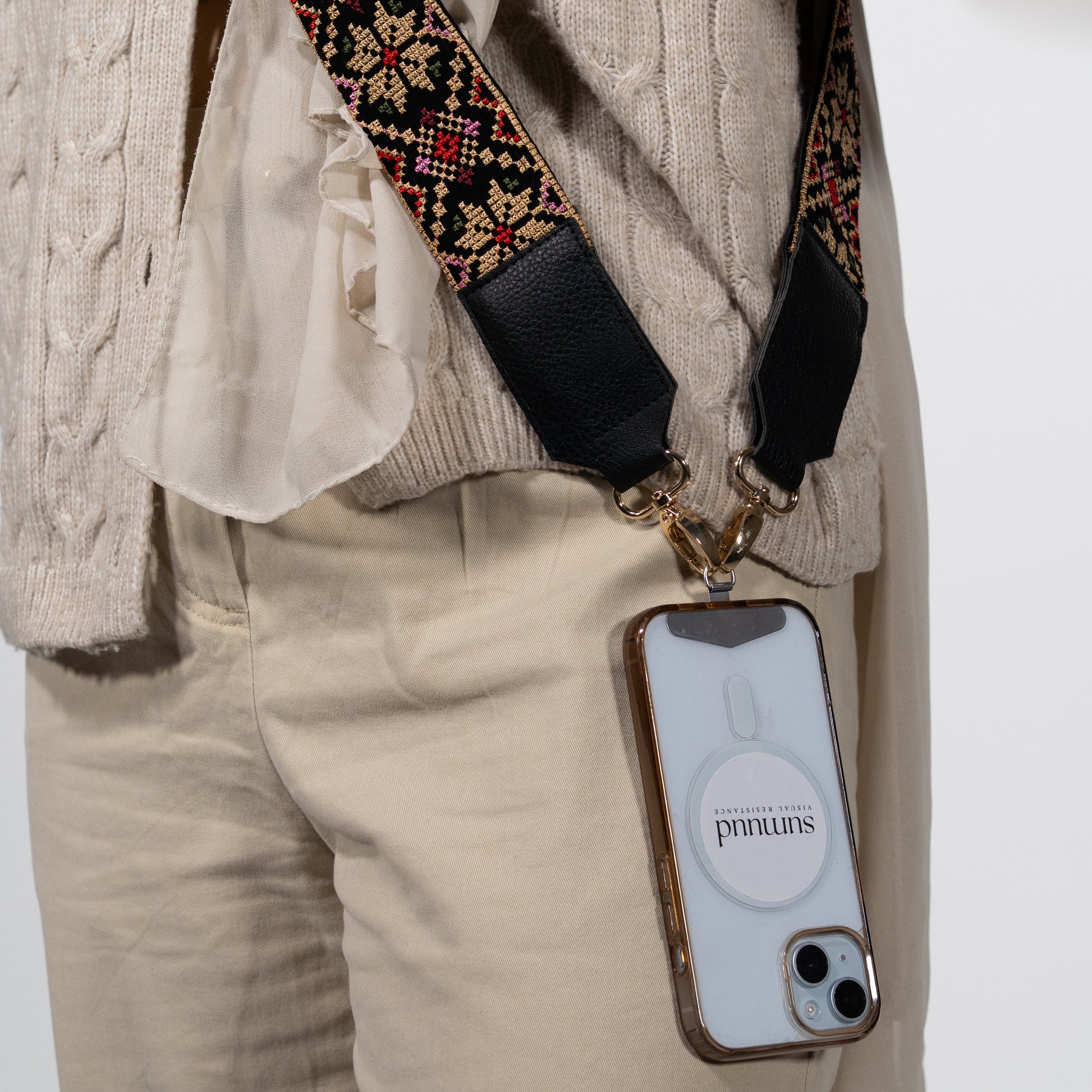Soft faux leather strap available in a variety of hardware colour options, embroidered with a traditional pattern with a beige base and multicoloured elements.