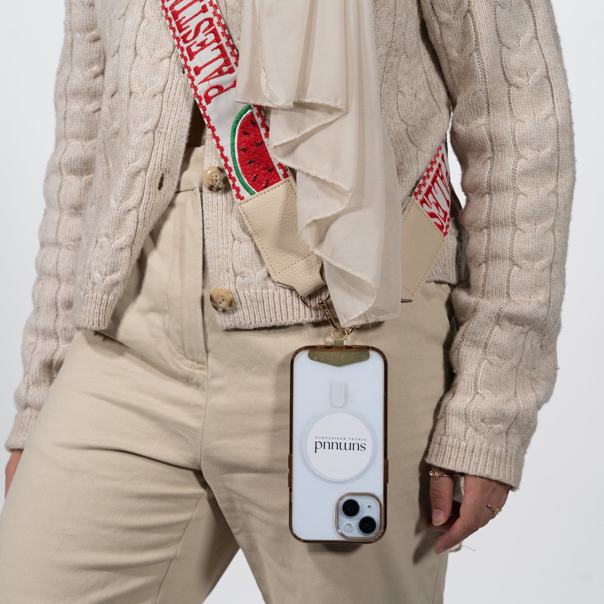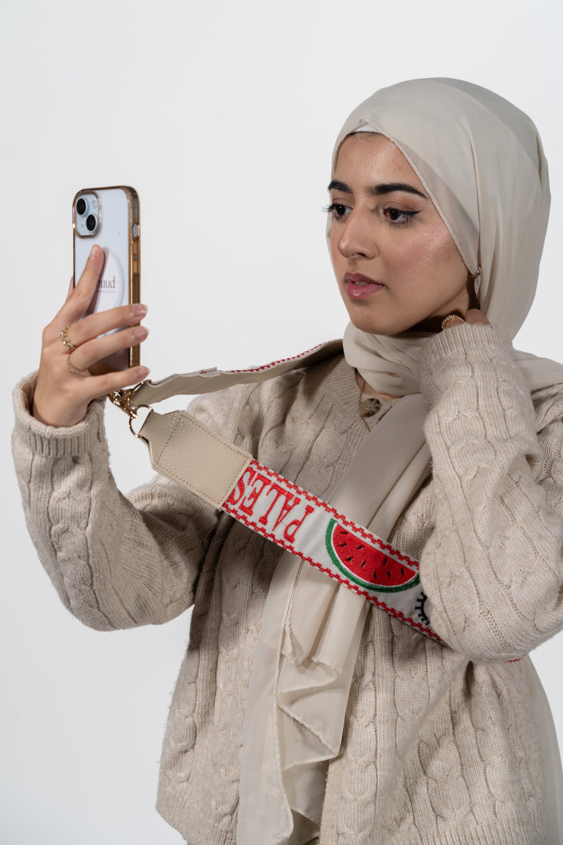 Soft faux leather strap, embroidered with symbols of Palestine; The watermelon and Handala,