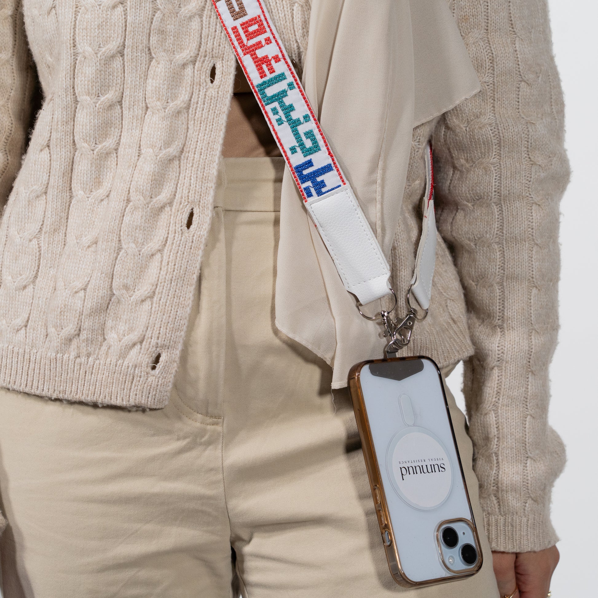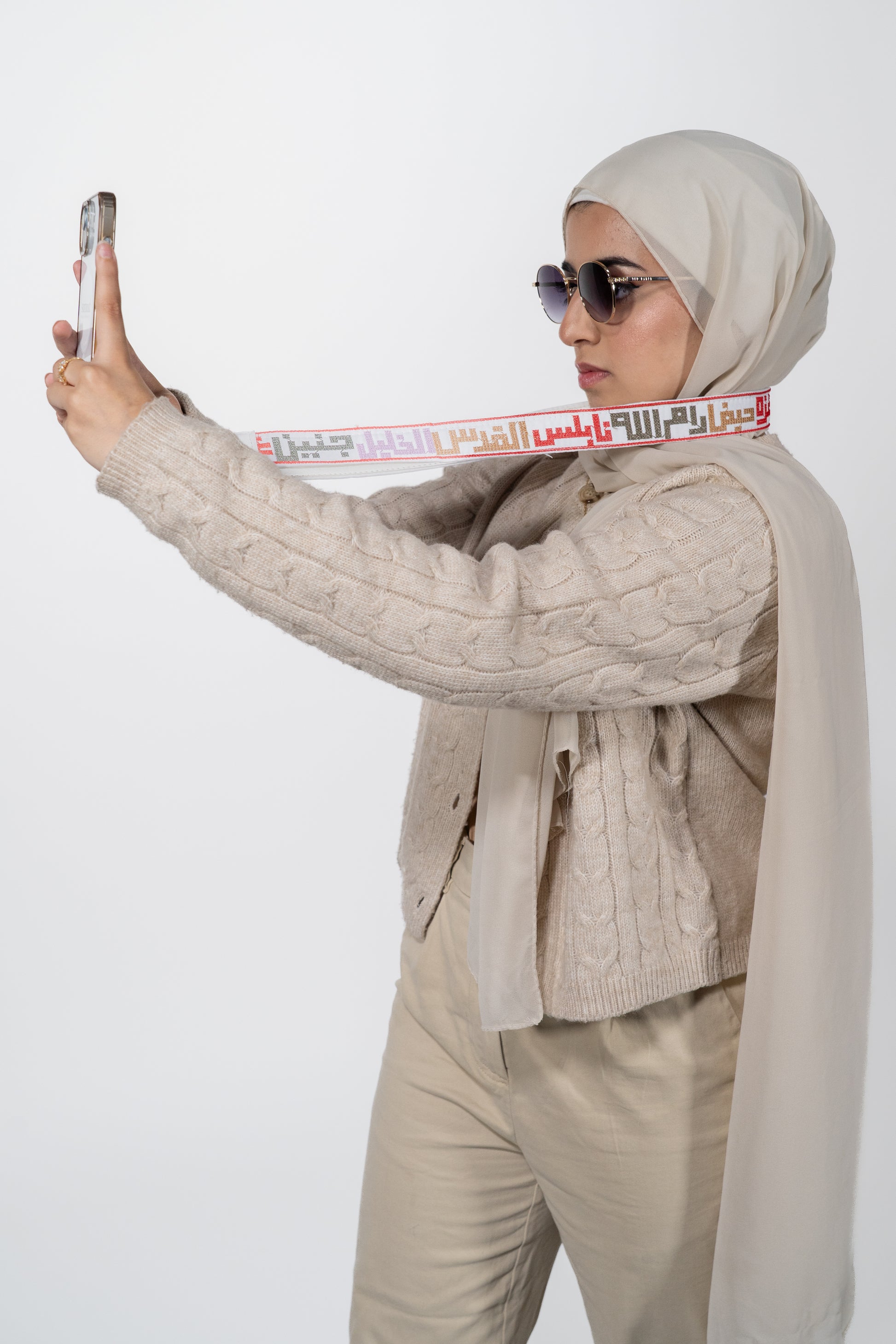 Soft faux leather strap available in silver and gold hardware, embroidered with the native names for the cities of Palestine in Arabic.