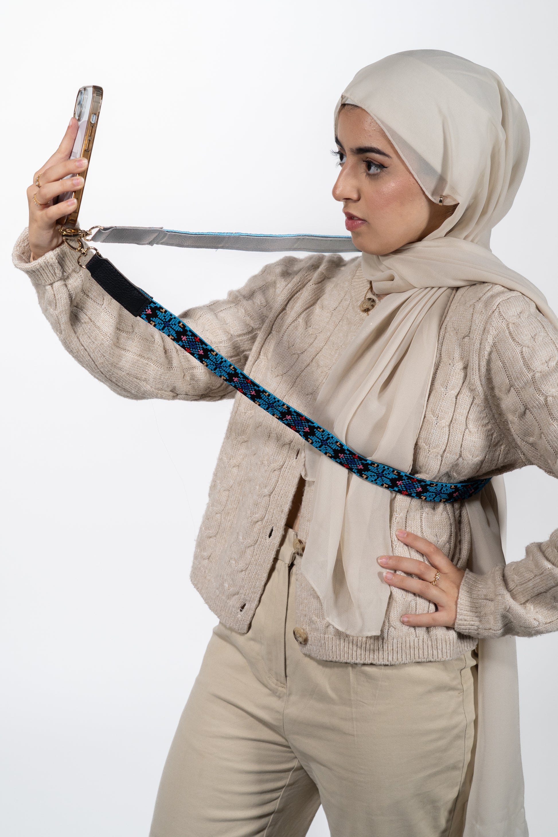 Soft faux leather strap available in gold and black hardware, embroidered with a traditional multicoloured pattern with a turquoise base, native to the indigenous in Palestine.