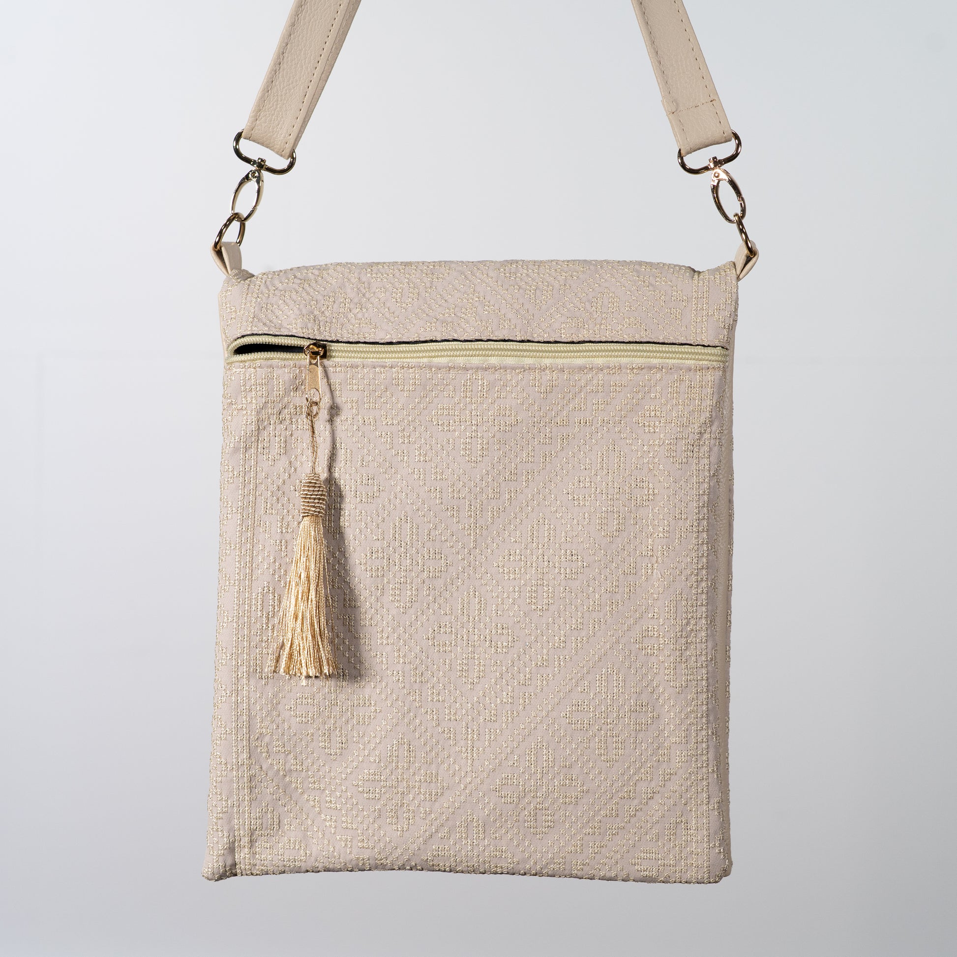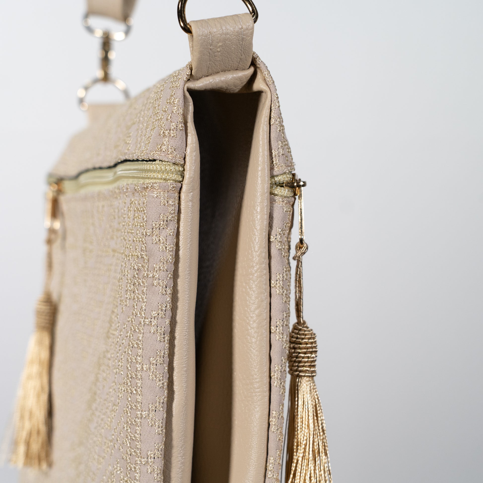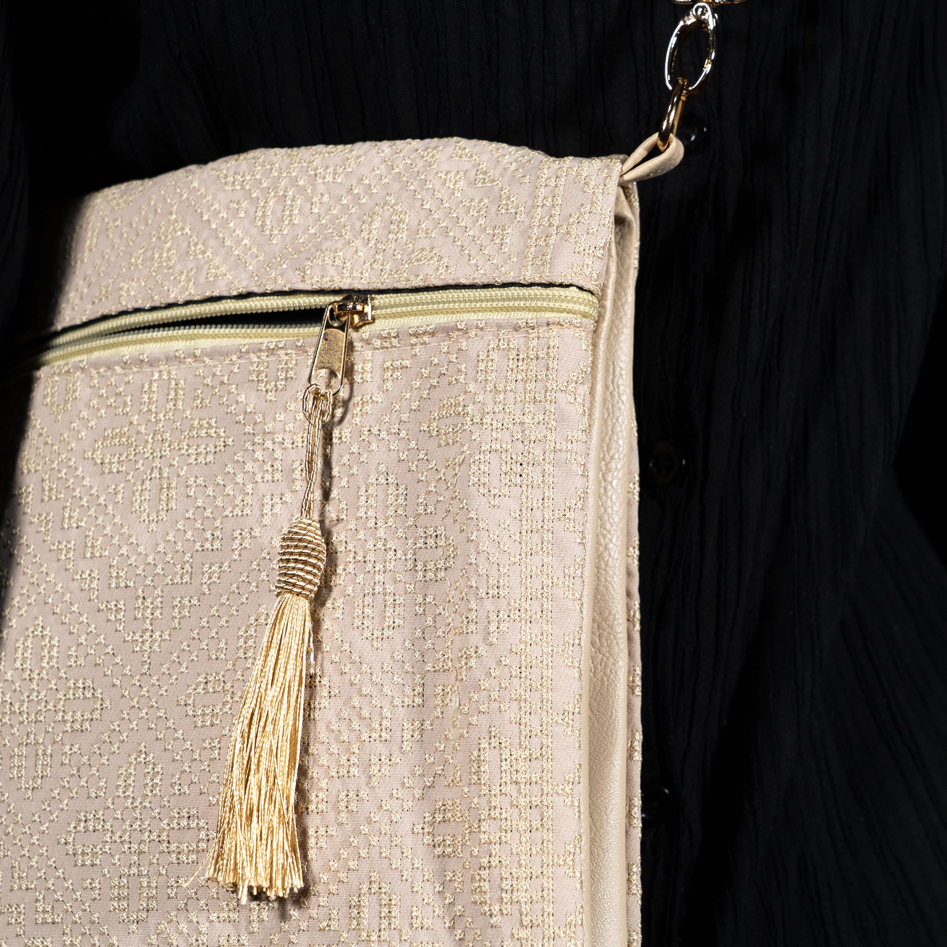 The Noorayn Bag is a luxurious, double-faced piece adorned with vibrant, intricate embroidery that beautifully celebrates Palestinian heritage.