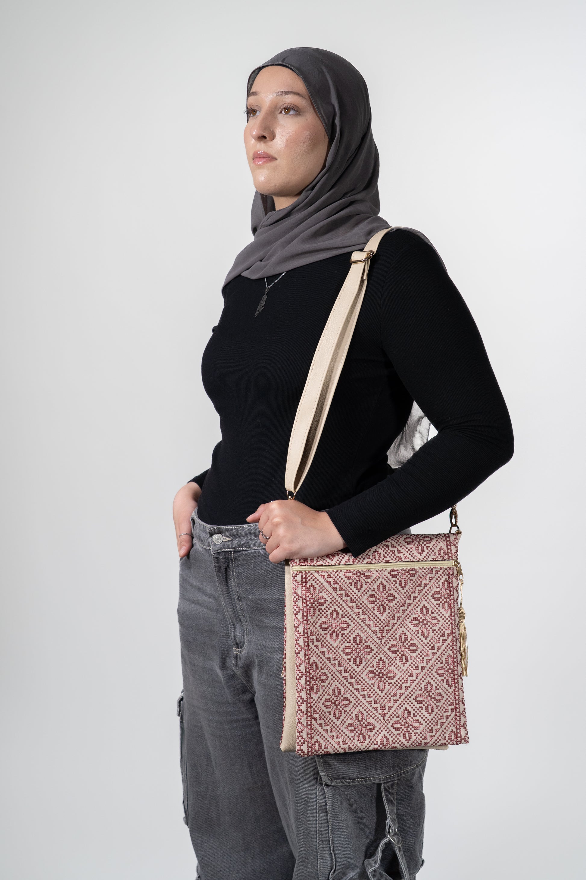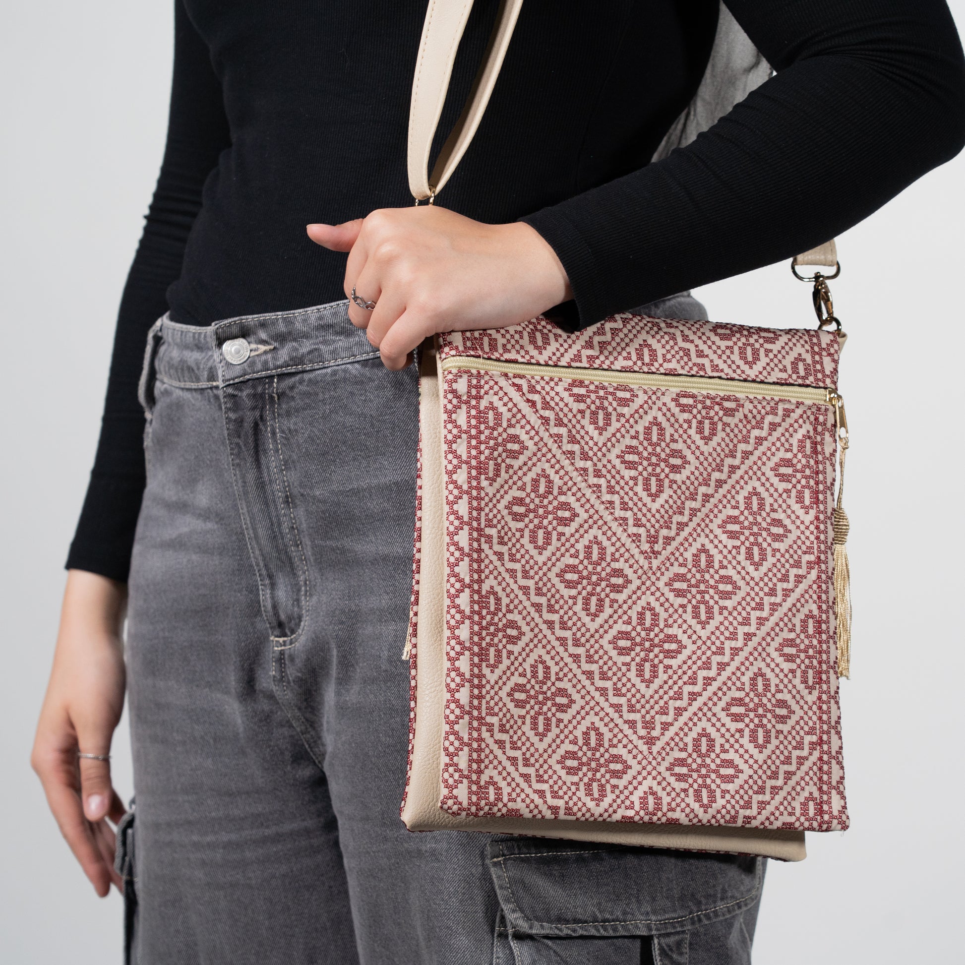The Noorayn Bag is a luxurious, double-faced piece adorned with vibrant, intricate embroidery that beautifully celebrates Palestinian heritage.