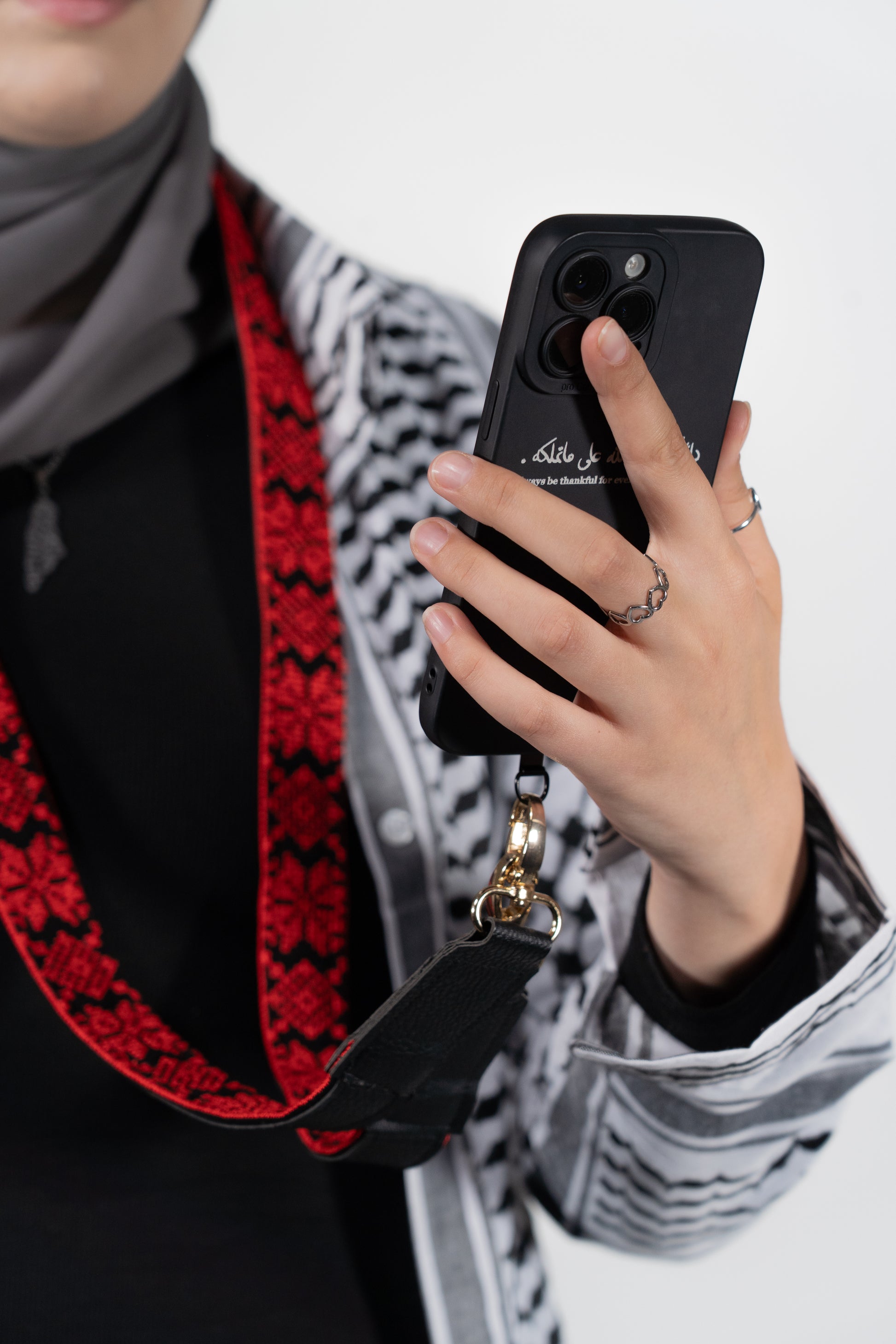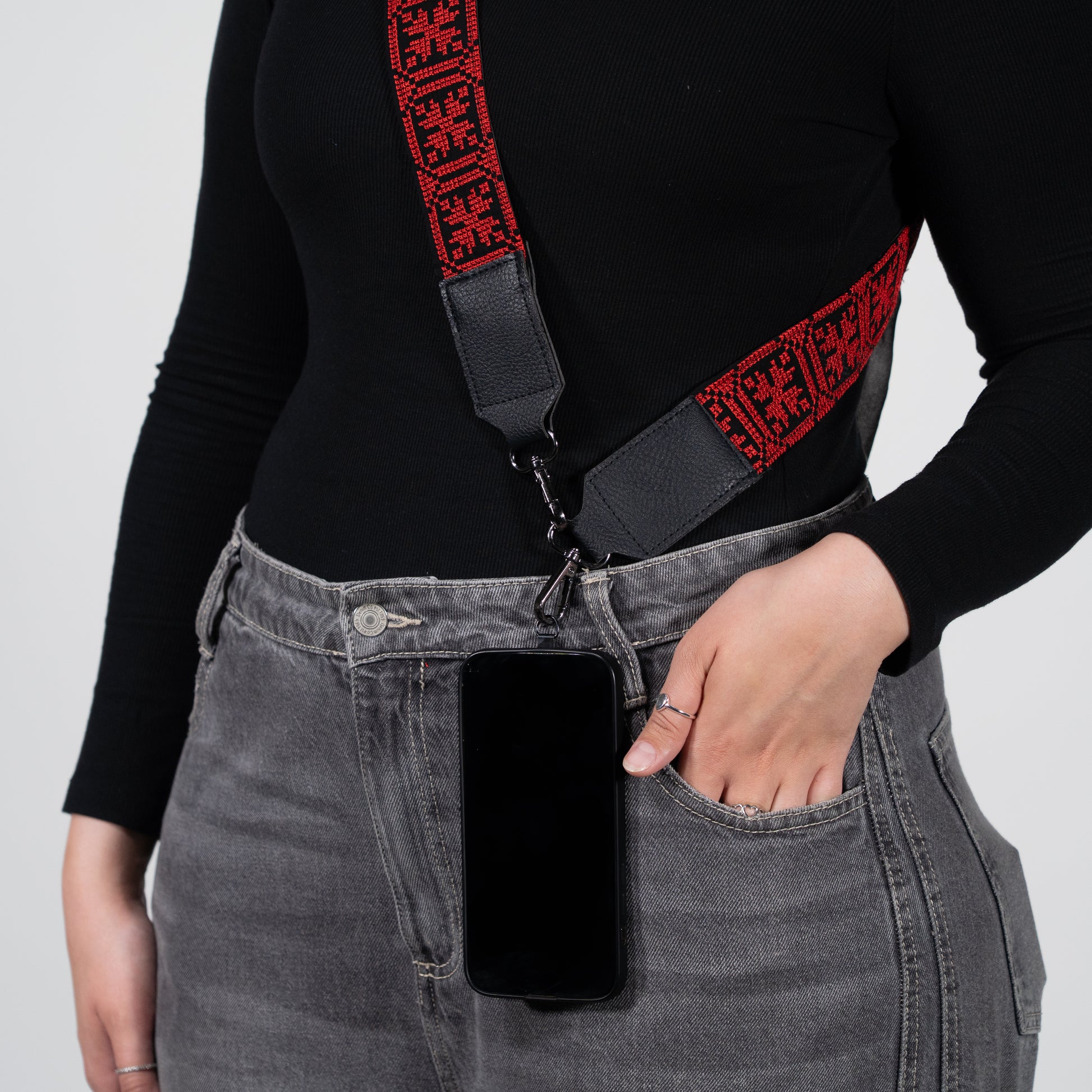 Soft faux leather strap available in a variety of hardware colour options, embroidered in a traditional red pattern indigenous to Ramallah in Palestine.